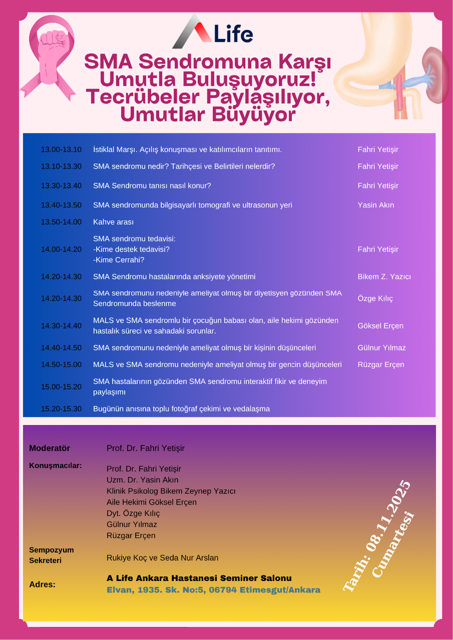 Sempozyum Moderatörü Prof. Dr. Fahri Yetişir’e, Sempozyum Sekreteri Rukiye Koç ve Seda Nur Arslan’a, kıymetli konuşmacılarımıza, bizlere ev sahipliği yapan Alife Hastanesi yönetimine ve salonu dolduran tüm hastalarımıza ve yakınlarına ayrı ayrı teşekkür ediyoruz. Her biriniz, cesaretiniz ve samimiyetinizle bu sempozyumu sadece bir bilimsel toplantı olmaktan çıkarıp büyük bir aile buluşmasına dönüştürdünüz. SMAS farkındalığını artırma yolculuğumuz, sizin desteğinizle büyüyerek devam edecek.
